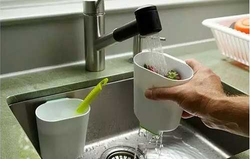 這款別致的廚房水槽伴侶采用了PVC材料制造,可以說是一款一物多用的產品。首先,它是一款稱職的垃圾箱,當我們切菜的時候,可以把它靠近切菜板,這樣,就可以將需要丟棄的垃圾直接放入到伴侶中,起到了小型垃圾箱的作用,從而避免污物將水槽堵死,非常人性化。