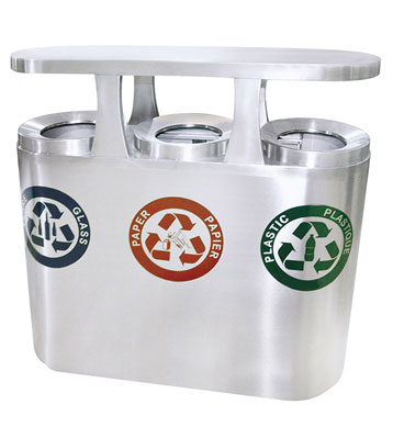 深圳新標準城中村街道社區不銹鋼五分類垃圾桶由有害垃圾、玻璃、金塑紙(為金屬、塑料、紙張的簡稱)、廚余垃圾、其他垃圾這5分類不銹鋼垃圾桶組合而成。其中金塑紙、其他垃圾日常產生量較大,所以分類收集容器也