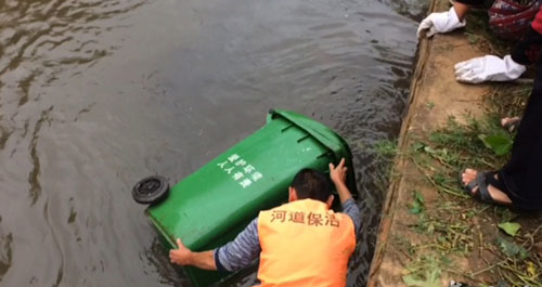 無辜垃圾桶被人拋下河 環衛工人冒險打撈