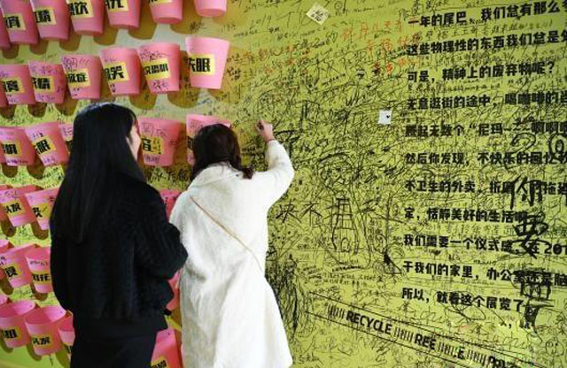 除了這些垃圾收集裝置,垃圾箱內的三面側墻和地面也成為市民宣泄的平臺,寫滿了戳心的留言。如“扔掉和我媽的溝通不暢”“2018我抑郁癥了,話更少了,希望你不要離開,一起去馬來西亞”……字字句句都反映出當代年輕人的生活壓力,以及對輕松、快樂的渴望。