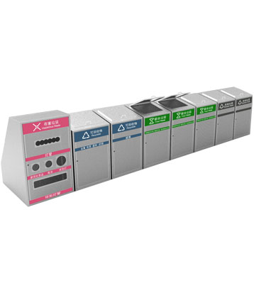 深圳新標準城中村街道社區不銹鋼五分類垃圾桶由有害垃圾、玻璃、金塑紙(為金屬、塑料、紙張的簡稱)、廚余垃圾、其他垃圾這5分類不銹鋼垃圾桶組合而成。其中金塑紙、其他垃圾日常產生量較大,所以分類收集容器也