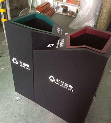 欣方圳鋼板噴塑分類垃圾桶表面經過除油、噴砂防銹處理后,再進行酸洗磷化處理;表面清理干燥后整體進行靜電噴涂或烤漆處理.。