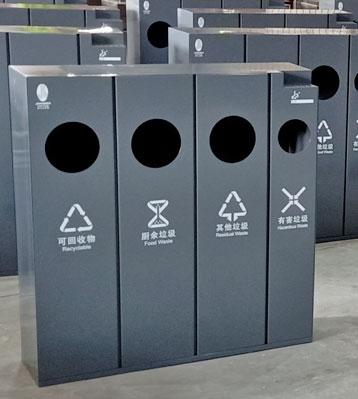采用足厚優質鋅板烤漆工藝制作而成,經酸洗磷化除油防銹處理,室內耐用升級。可做可回收物、其他垃圾、有害垃圾、廚余垃圾4分類垃圾收集使用。