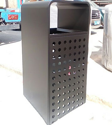 鋼板沖孔單桶戶外烤漆垃圾桶本身經噴砂處理去油去銹后,鋼板表面抗紫外線丙稀酸油漆多層噴涂,經戶外粉高溫烤漆戶外擺放艷麗耐腐蝕,桶頭圓角設計。