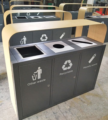東莞樓盤定制戶外三分類仿木紋鋼制烤漆垃圾桶