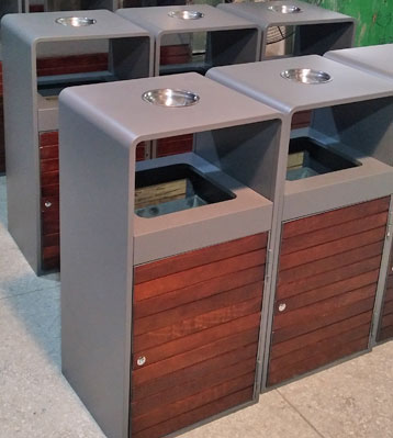 鋼木分類果皮箱桶頂嵌入煙灰盅,加入小石子可做戶外廣場等公共區域滅煙裝置及煙蒂收集使用,能減少環衛工清掃強度,圓弧邊角避免防撞,深灰色搭配鋼木顏色美觀大氣!
