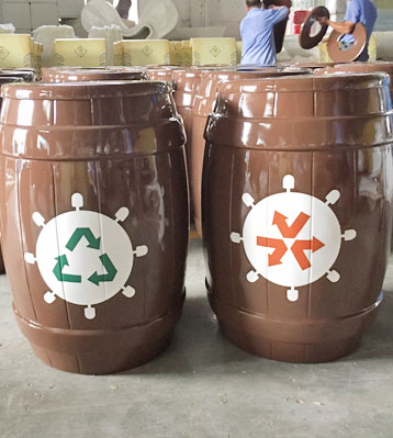 玻璃鋼仿木桶分類垃圾桶打造北海水樂園原生態景區