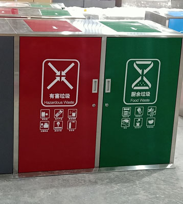 桶身面板紅、藍、綠、灰4色分別代表有害垃圾、可回收物、廚余垃圾、其他垃圾專用收集容器,分色烤漆絲印新標準垃圾分類標識,絲印新款垃圾分類標識清晰醒目,有助從源頭垃圾精準投放,便于后期分揀回收垃圾減量。