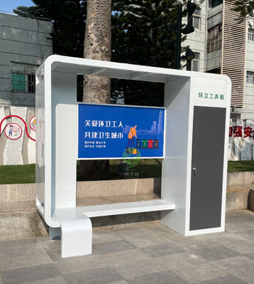 深圳大浪街道這款環(huán)衛(wèi)工人休息歇腳亭,由大浪街道黨工委決定由街道市政中心牽頭設(shè)計,集環(huán)衛(wèi)工具箱和休息座椅實用性功能于一體,欣方圳工廠生產(chǎn)...