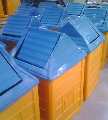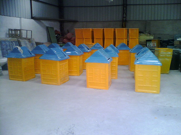 玻璃鋼搖蓋垃圾桶桶身和內膽部分,采用高級玻璃鋼材質一次成型,經過打磨、除塵 、噴漆等一系列后期工藝然后出成品。