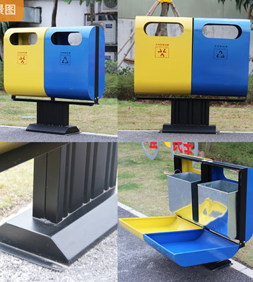 黃色用于不可回收垃圾收集、藍色用于可回收垃圾收集使用,配置鍍鋅內(nèi)桶,投口上提式打開可輕松取出內(nèi)桶收運垃圾,底座預留孔位打膨脹螺絲與地面固定,可長期擺放戶外用于2分類垃圾收集使用,穩(wěn)固耐用!